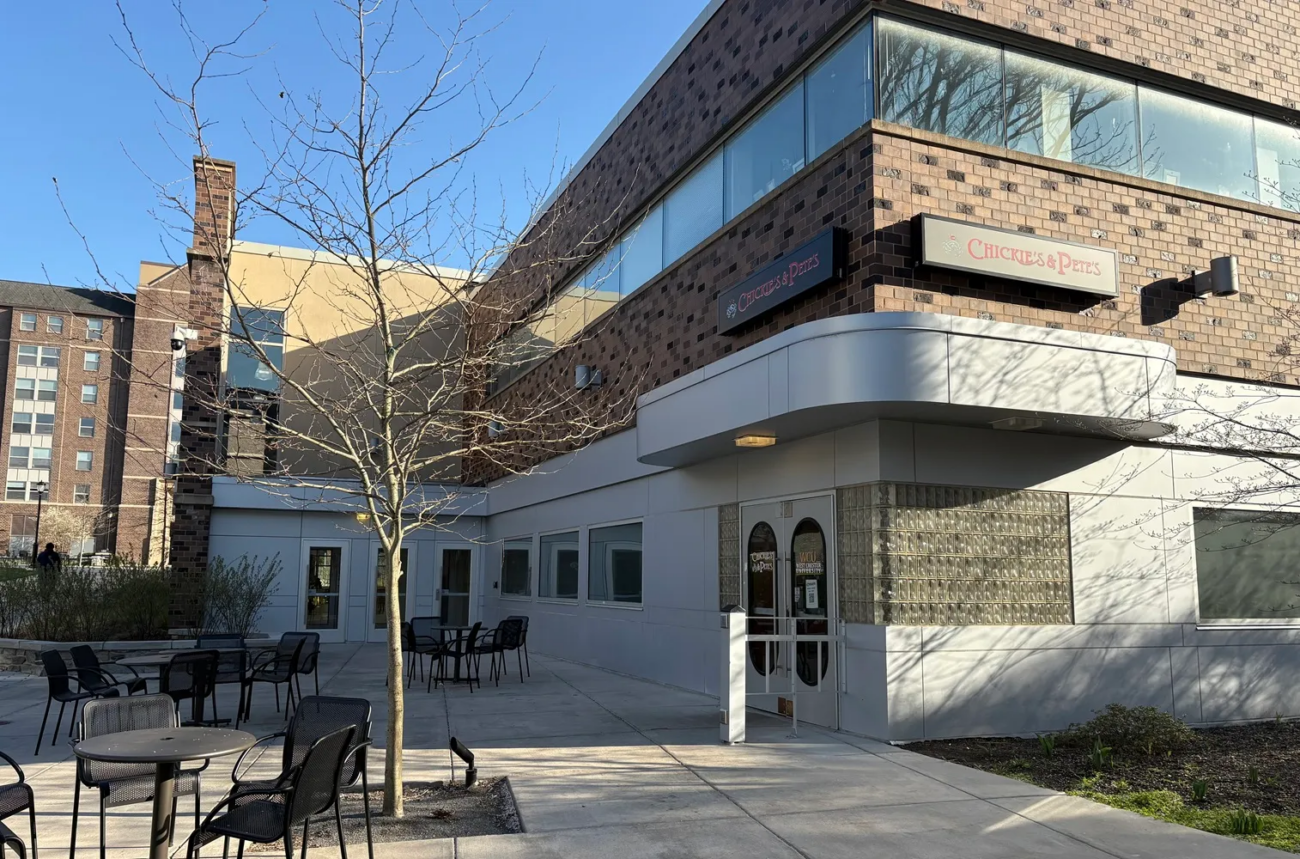 Located outside of the Lawrence Center are a collection of shaded tables surrounded by a calming scenery of fresh plants. While the hustle and bustle of students are indoor, ordering food at the Einstein Bagels or upstairs at the multitude of student centers, the outdoor benches offer a quieter setting for studying. Typically only the soft chatter of passing students can be heard, offering a comforting white noise.